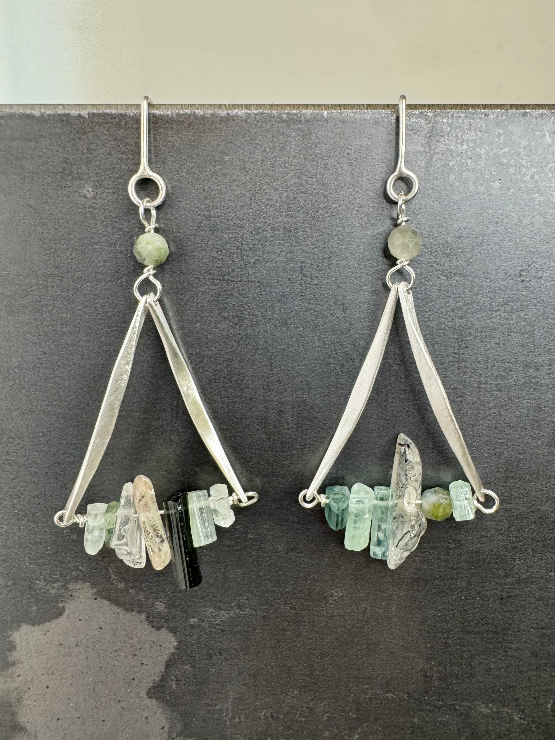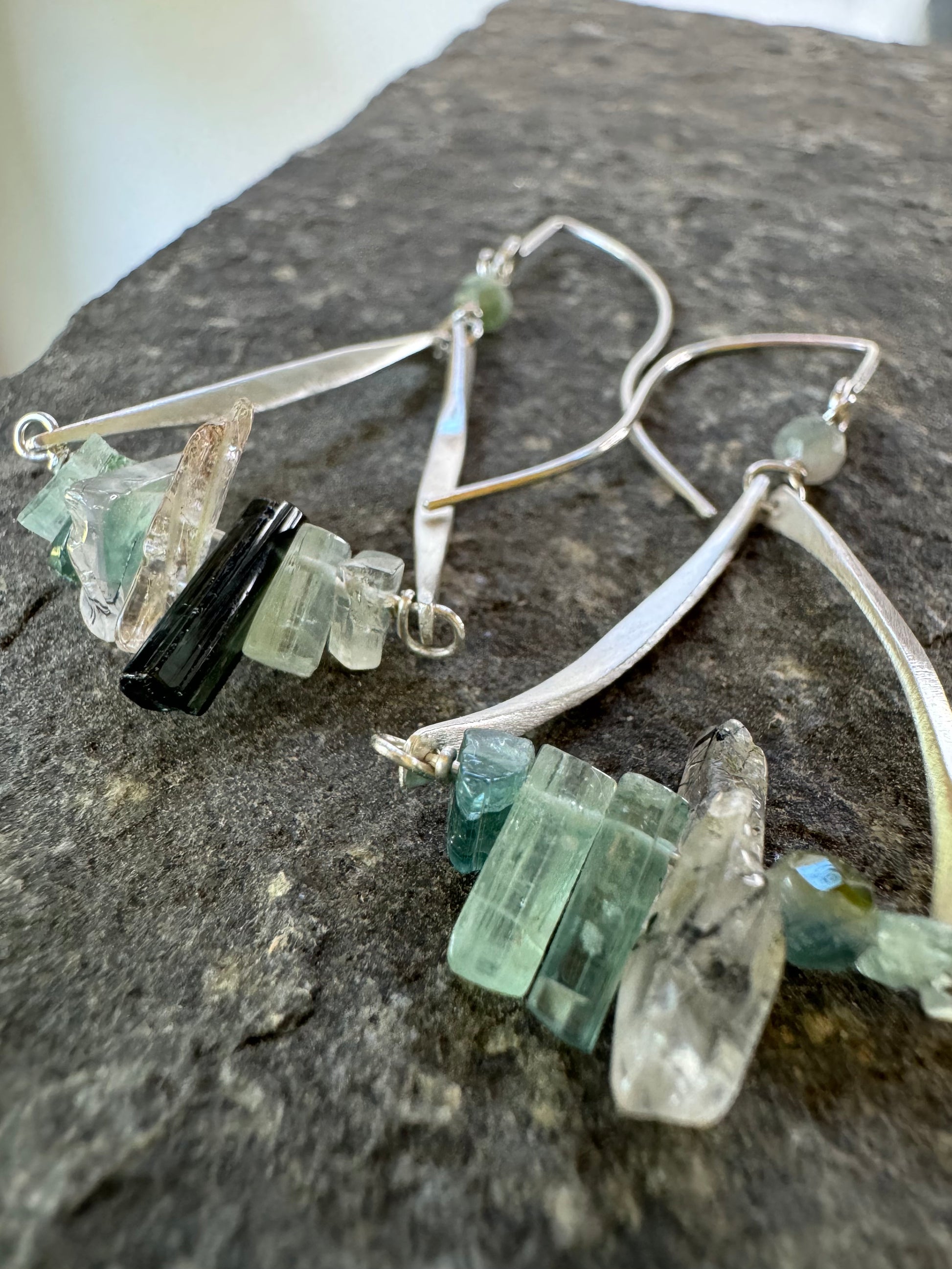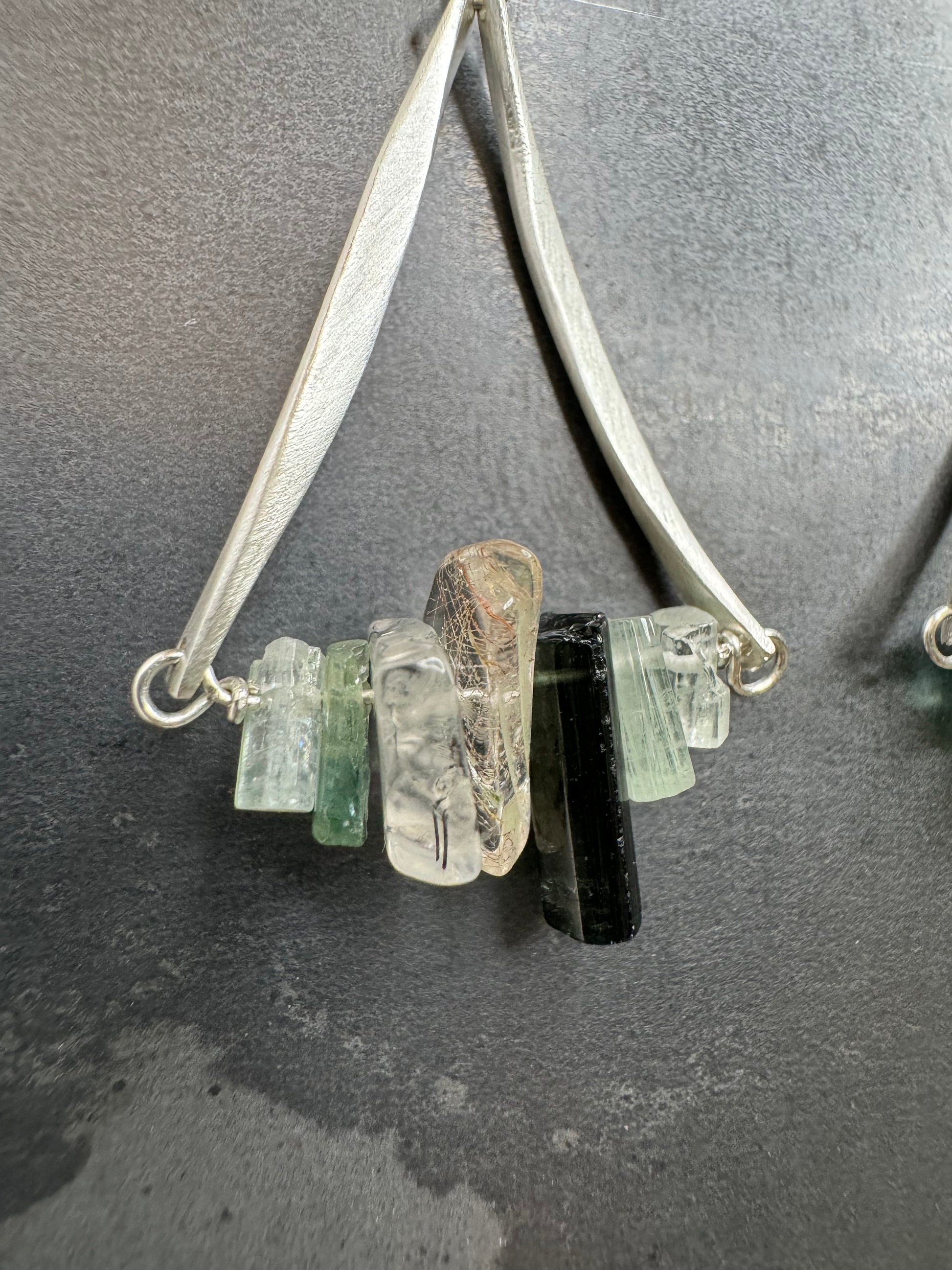 A fresh mix of raw tourmaline crystals in aqua and deep green are paired with tumbled quartz with golden and black needle inclusions. The graduated line of soft-hued stones dangle from hammer-forged bone links and spring green tourmaline beads.